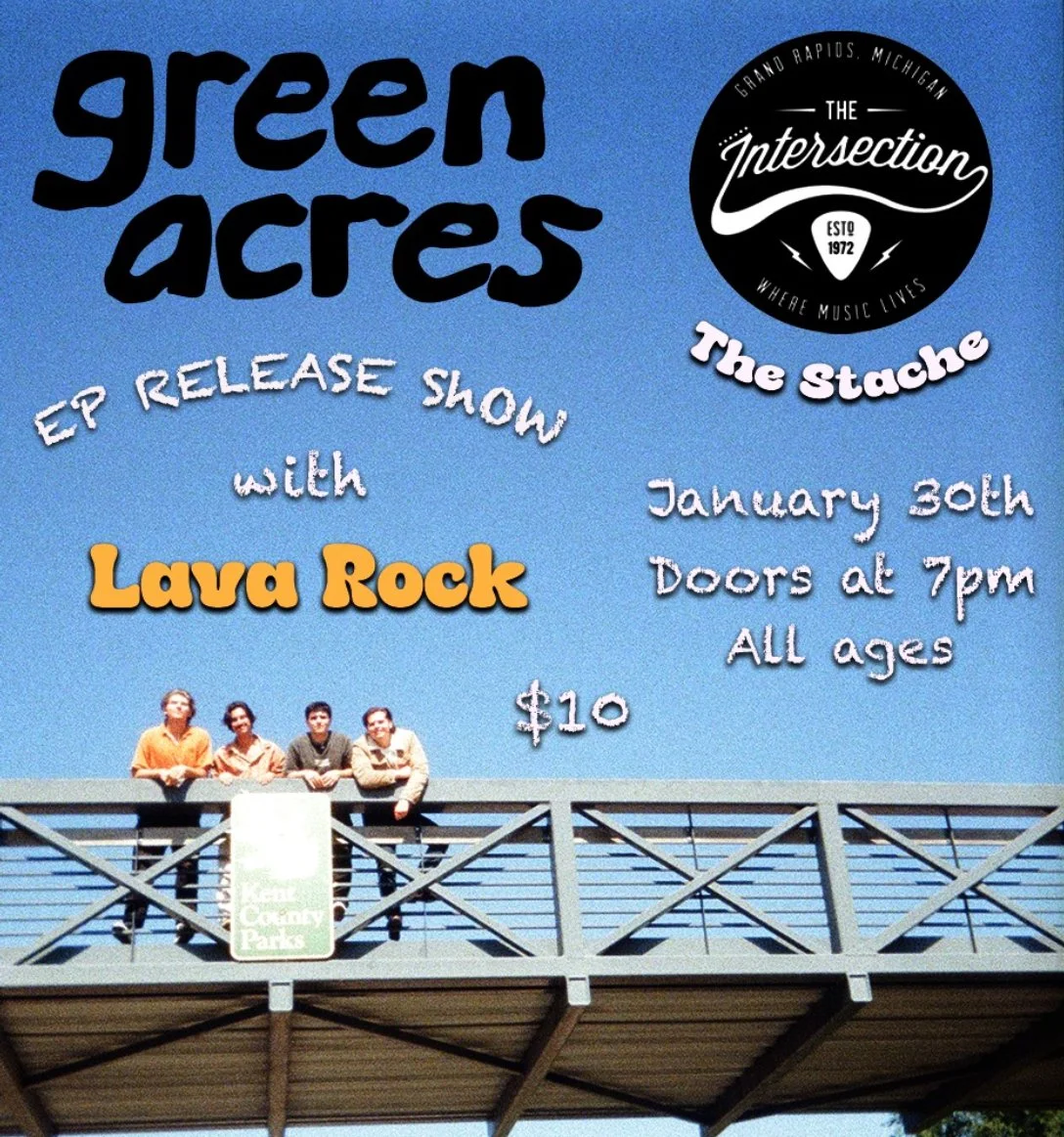 Back to All Events The stache @ The Intersection Saturday, January 30, 2027 7:00 PM 10:00 PM The Stache @ The Intersection 133 Cesar E. Chavez Avenue Southwest Grand Rapids, MI, 49503 United States (map) Google Calendar ICS Click to purchase tickets! Lava Rock is opening for Green Acres, who are performing to commemorate their new EP, “Backyard Orchard.” Tickets are $10, and can be bought at the door, or by clicking the photo to purchase directly from venue site.Would love to see you there!